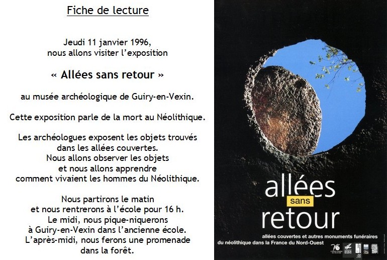 En amont de la visite de l'expo « Allées sans retour » avec les enfants, Monique engage un travail de questionnement à partir de l’affiche, afin de susciter curiosité, soif et même désir que les enfants ne pourront satisfaire que par la mise en situation.